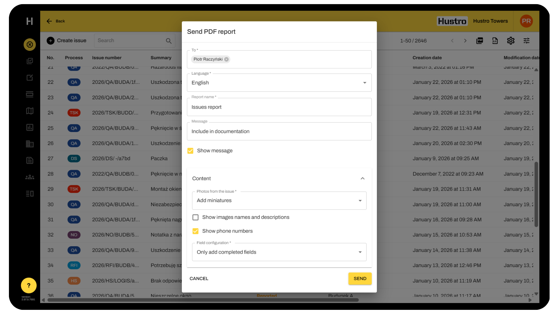We added the ability to decide whether a message entered during report sending should be displayed in the PDF file.